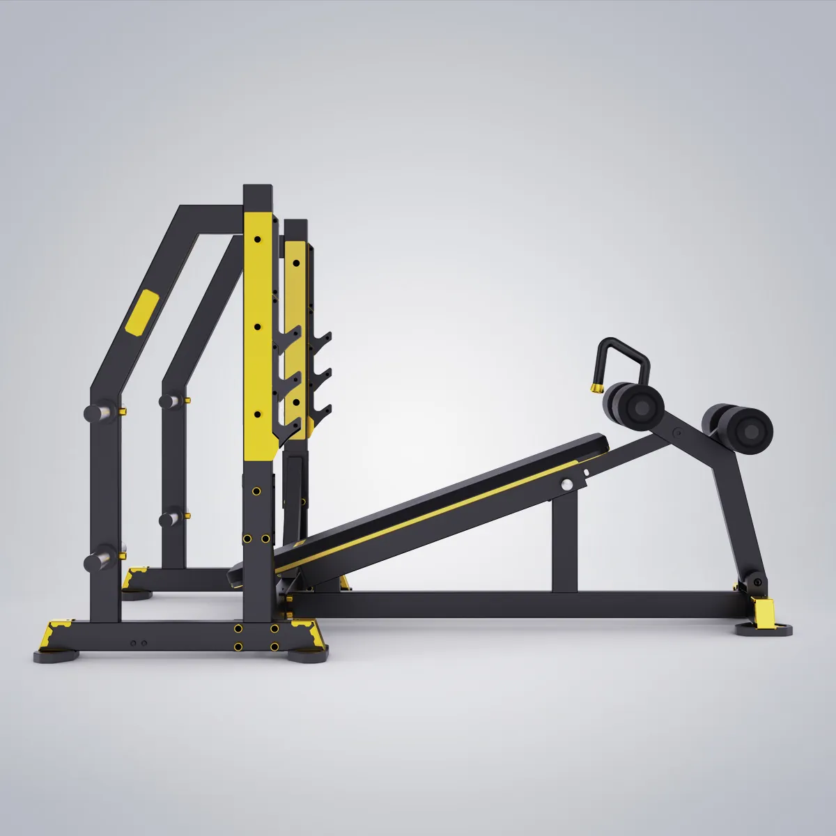 Negative declined bench with four hooks for barbell and eight weight horns.