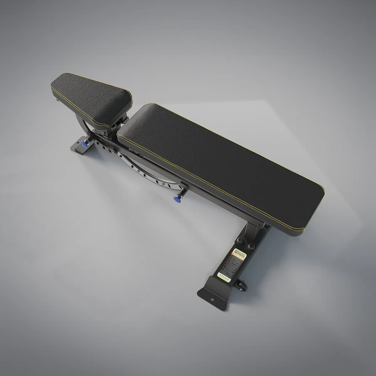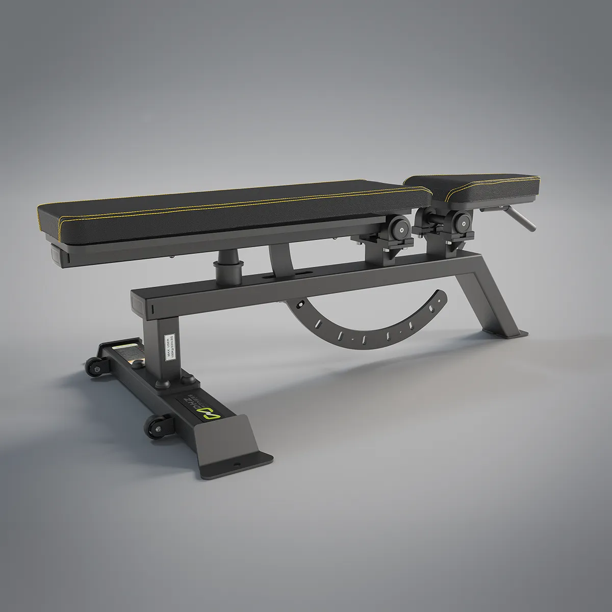 Dumbbell bench with adjustment of seat and backrest. Wheels for mobility. Adjustable at different angles.