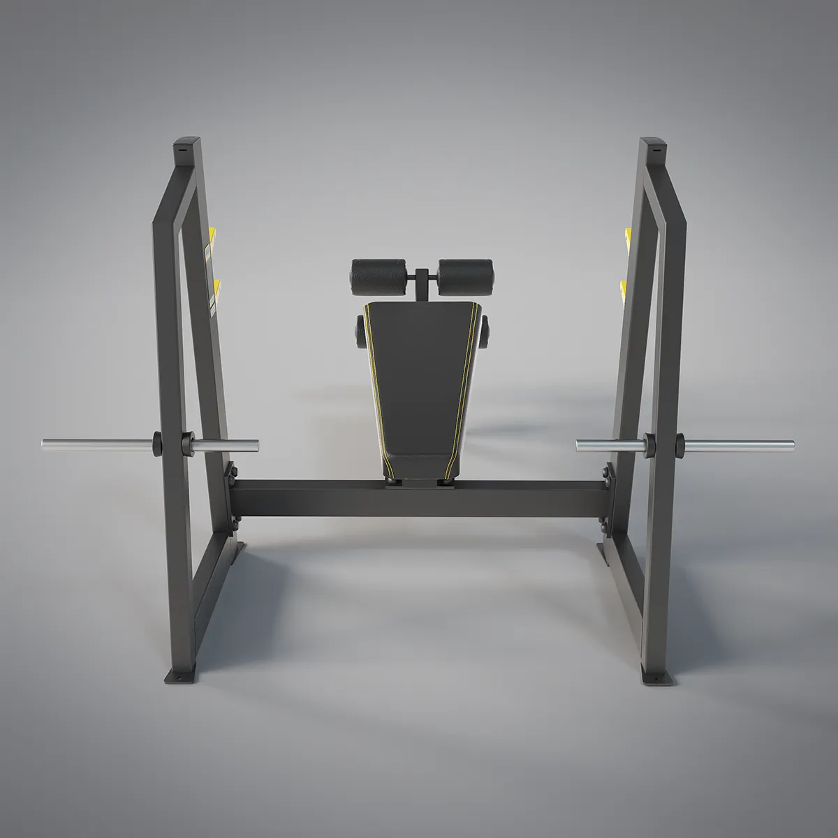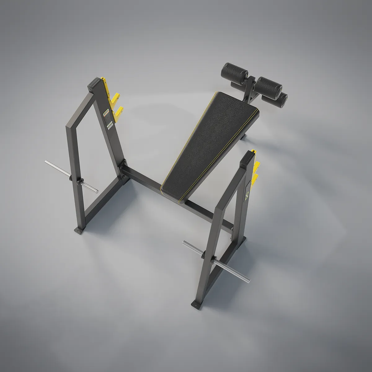 Negative inclined bench with two mounts for dumbbell bar and four weight shelves. The polyurethane coating reduces wear and ensures quiet training.