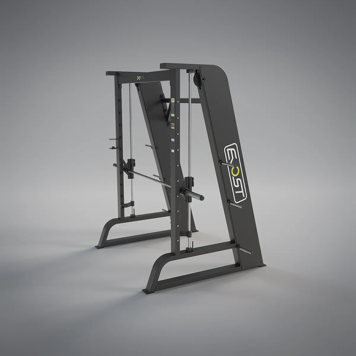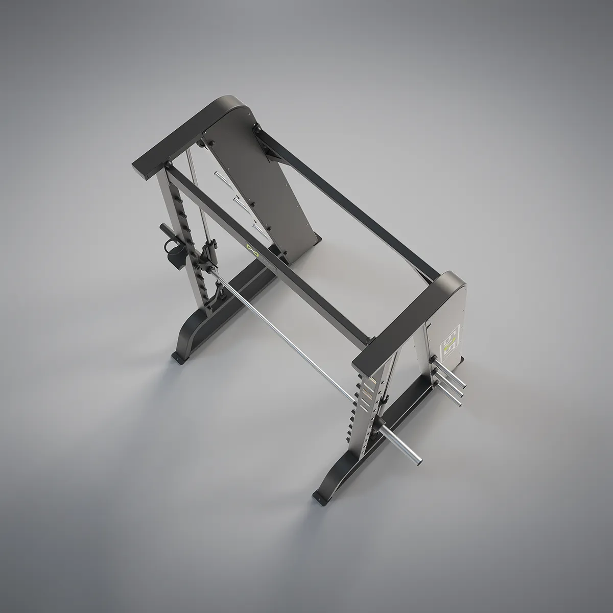 Due to the negative angle, a natural movement is particularly supported during pressure exercises and squats. A closed guide rail with safety latches offers quick and easy adjustment. Six wank shots.