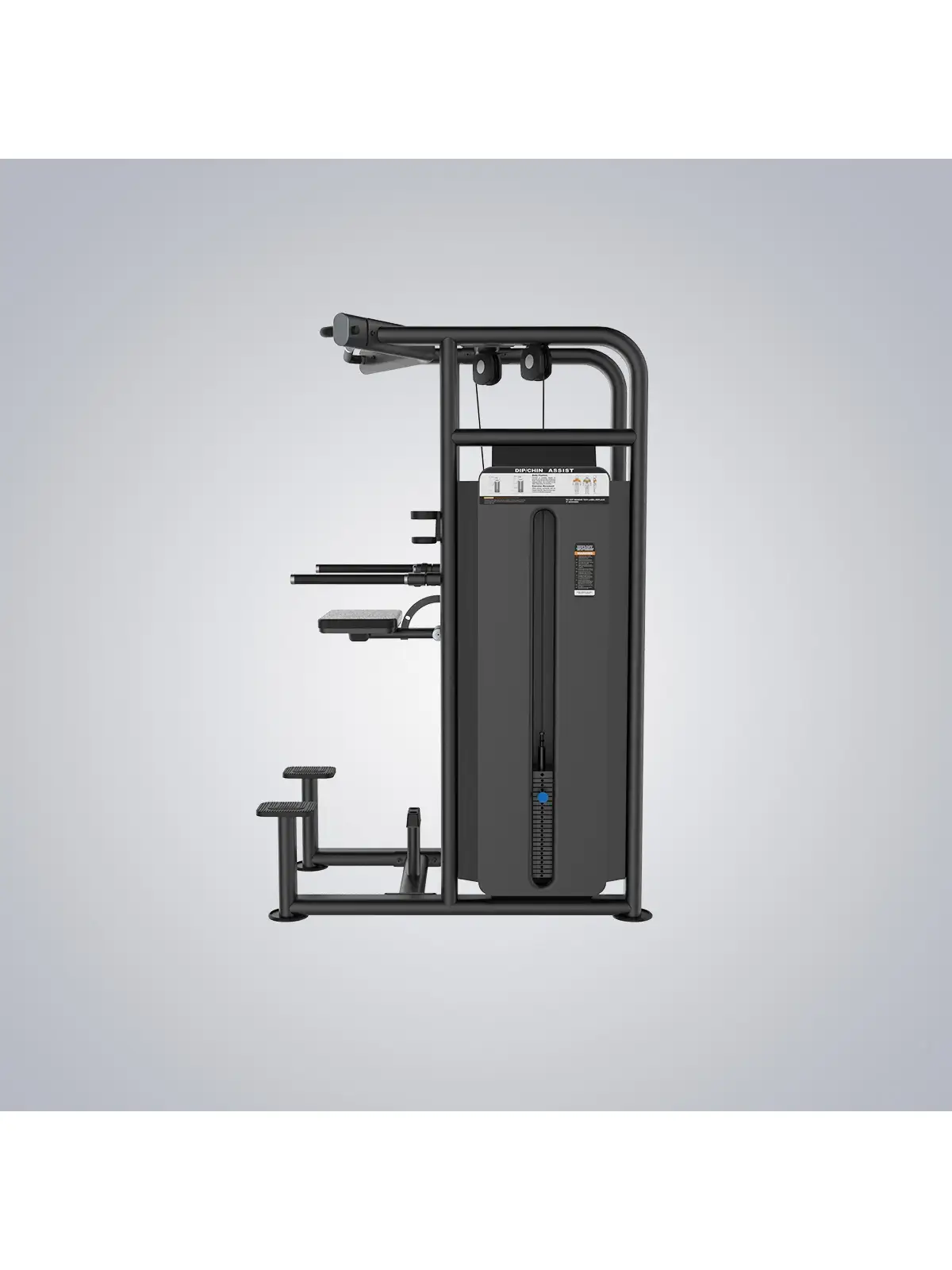The EVOST III series Dip-Chin Assist is a sophisticated dual-function system. Large running boards, comfortable knee pads, rotatable tilt handles and multi-position pull bars are part of the highly versatile Dip-Chin Assist device. The knee protector can be folded in to allow the user an unsupported training. The linear bearing mechanism guarantees the overall stability and durability of the device. The adjusted weight reduces the necessary pulling force.