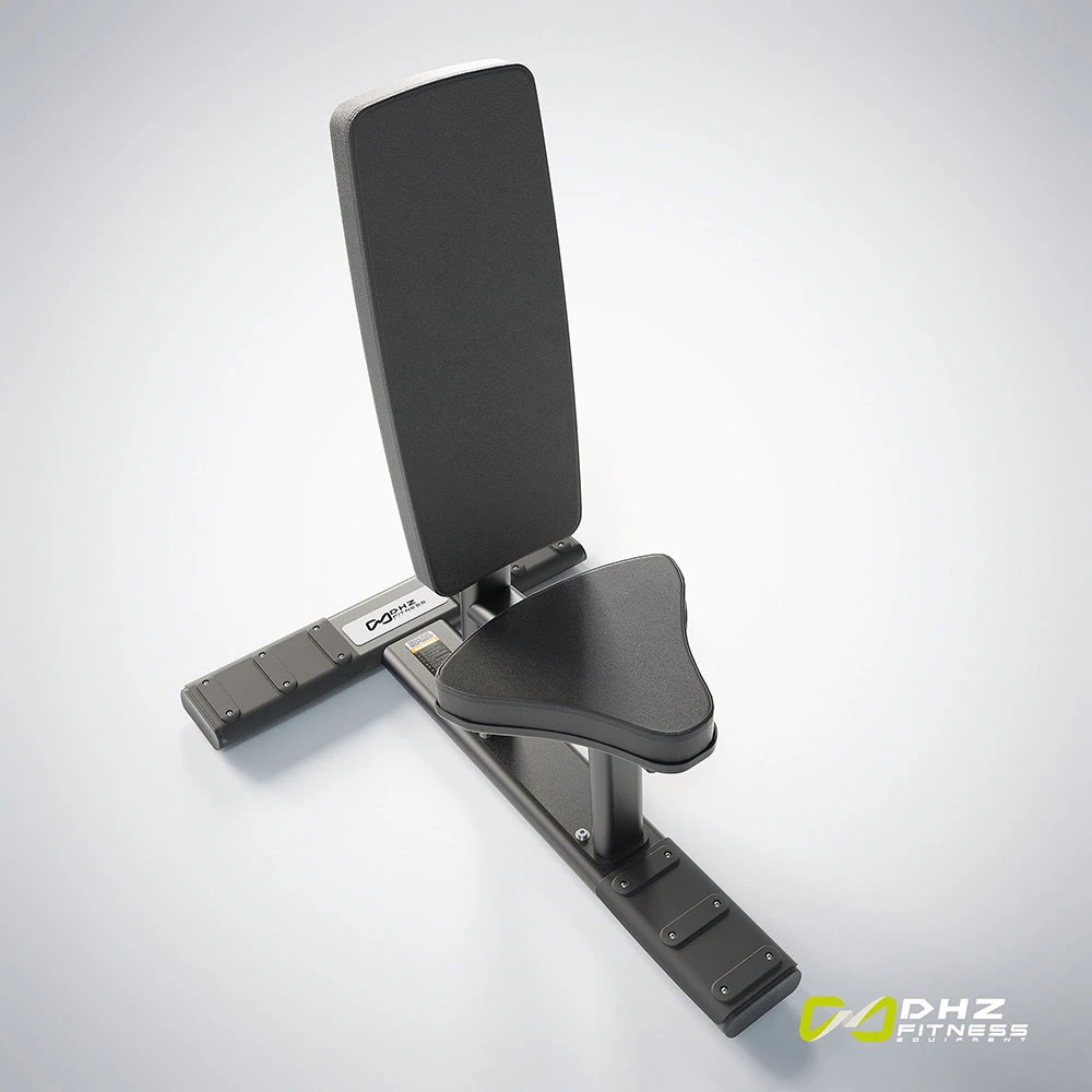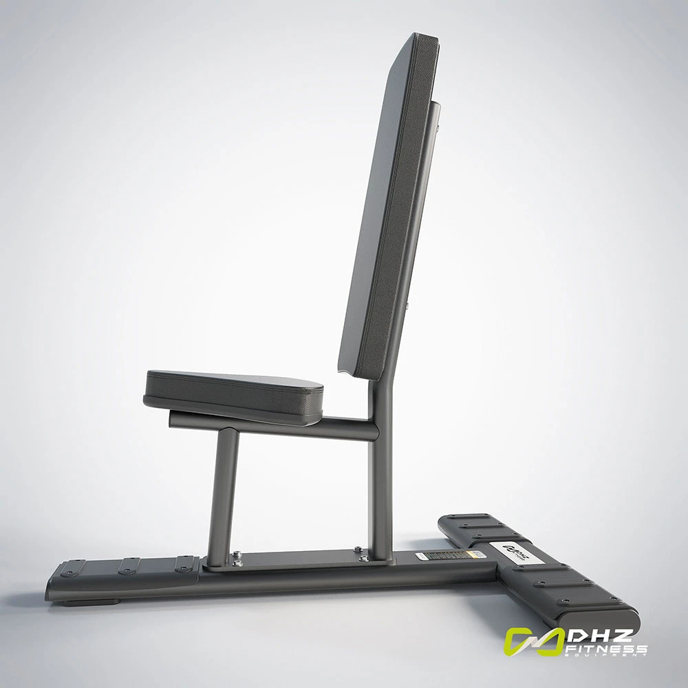 Sitting position with inclined back cushion, close to the ground for stability and comfort. Footrest for stability. Integrated transport rollers.