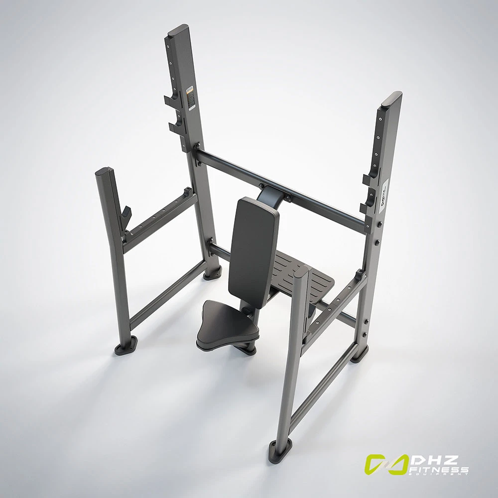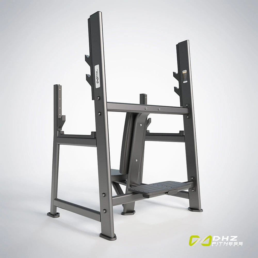 Seated weightlifting, standing plate for helpers. The urethane sheath reduces wear and ensures quiet training. Shaped urethane pads protect the frame.