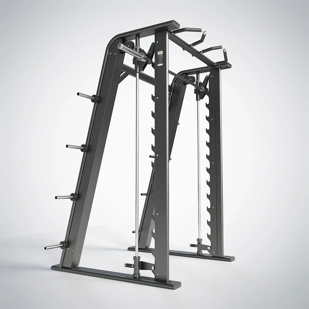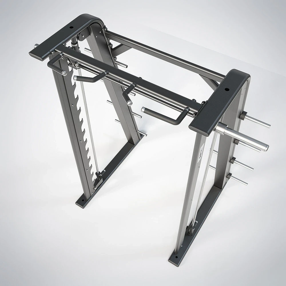 Due to the negative angle, a natural movement during pressure exercises and squats is particularly supported low starting weight due to counter weights. A closed guide rail with safety latches offers quick and easy adjustment. Eight weight ups.